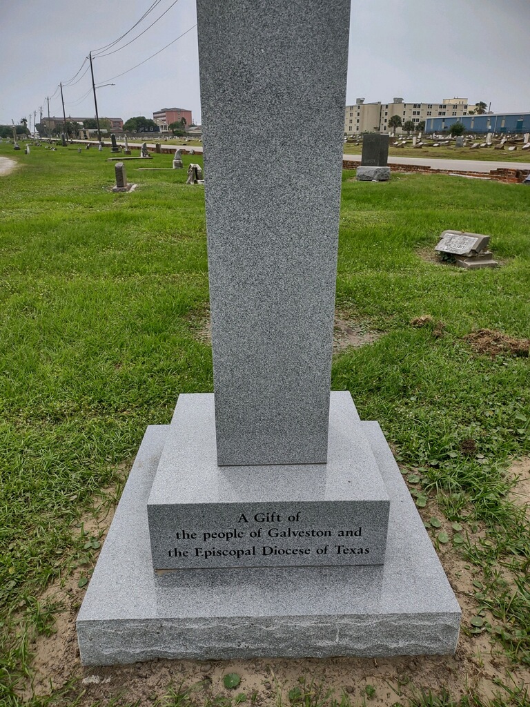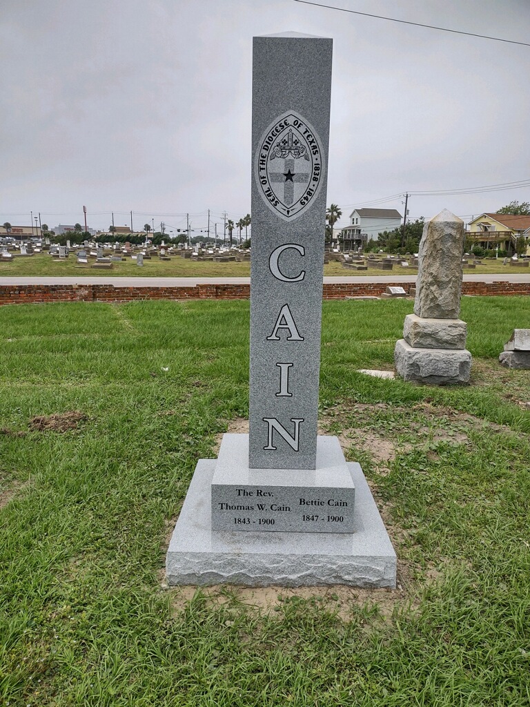 Created using funding from the John and Joseph Talbot Fund through the Episcopal Diocese of Texas Racial Justice Initiative, the Cain marker in the cemetery where the Reverend and his wifeโs remains rest, is an 8-foot obelisk bearing witness to the work of the church and the commitment of the Episcopal Diocese of Texas to the people on Galveston Island.
