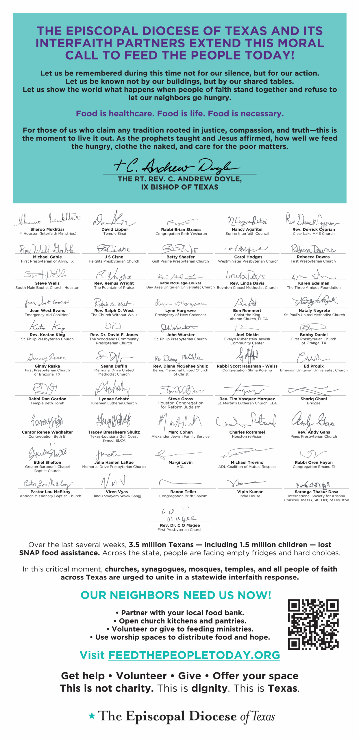 The Episcopal Diocese of Texas and its interfaith partners extend a strong and united moral call to feed the people today in Texas newspaper ad campaign beginning Sunday, November 23 in various markets